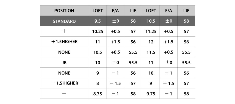 | 458cc | 9.5° ~ 10.5° | 58° | 1.5° ~ -1.5° | 195g (±2) |